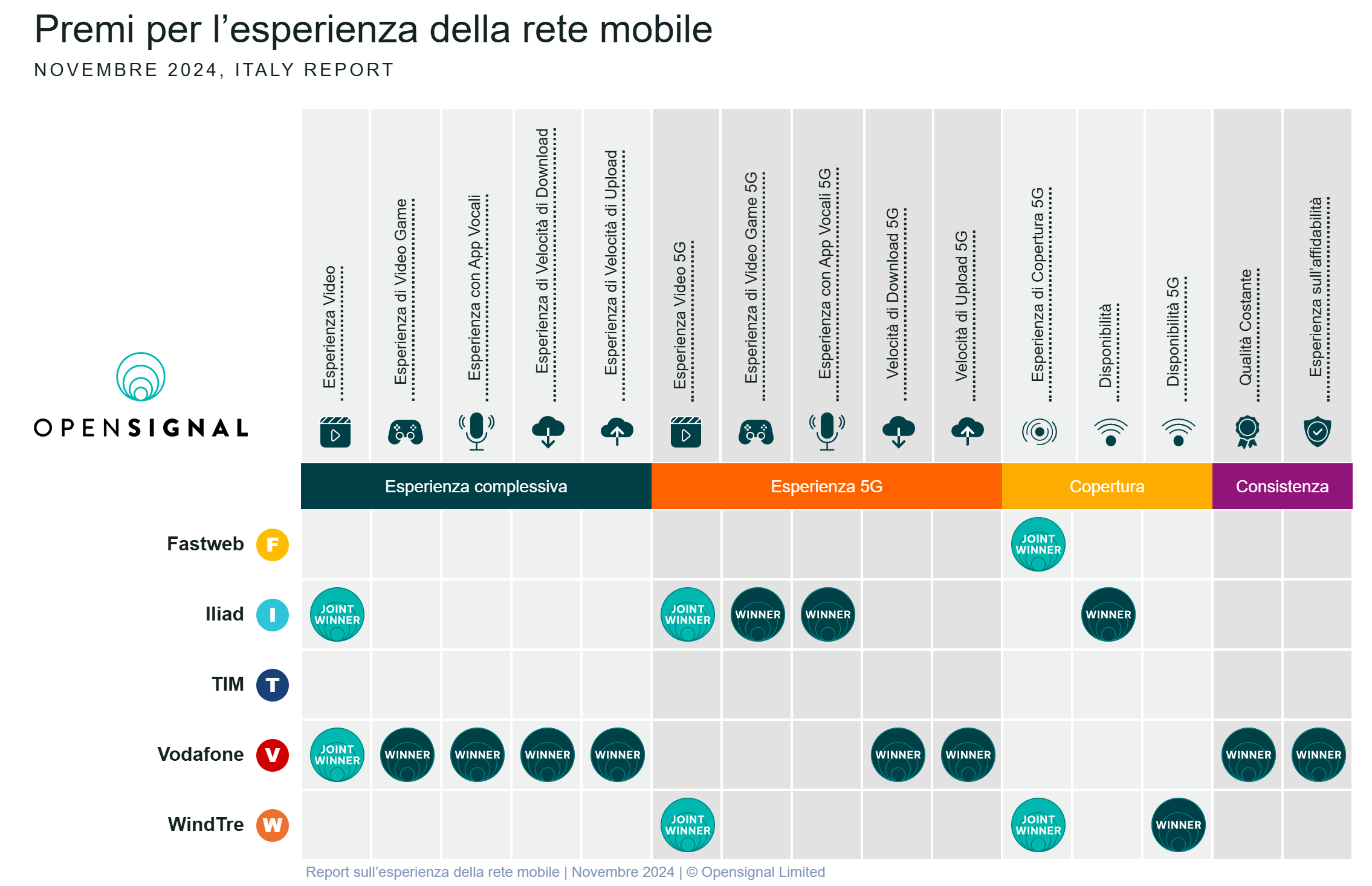 L'immagine qui di sotto riassume i migliori operatori di telefonia mobile in Italia secondo l'analisi di OpenSignal per le varie categorie considerate dallo studio: