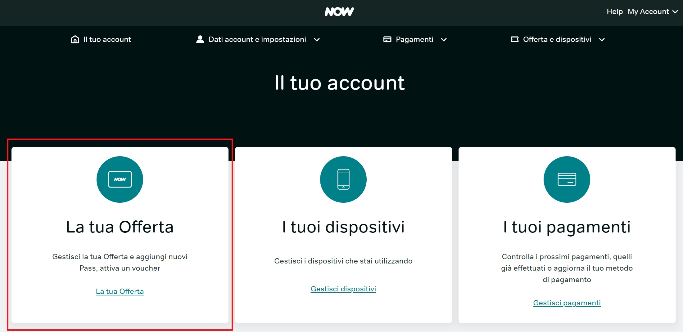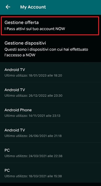 A questo punto, bisogna premere su Accedi per completare il login con il proprio account e poi premere nuovamente su My Account > Gestione account. Andando su Offerte e dispositivi > Le tue Offerte è possibile accedere all’elenco dei Pass attivi con NOW. Da qui si può disattivare il rinnovo automatico di uno o più Pass, gestendo in modo completo l’abbonamento in corso.